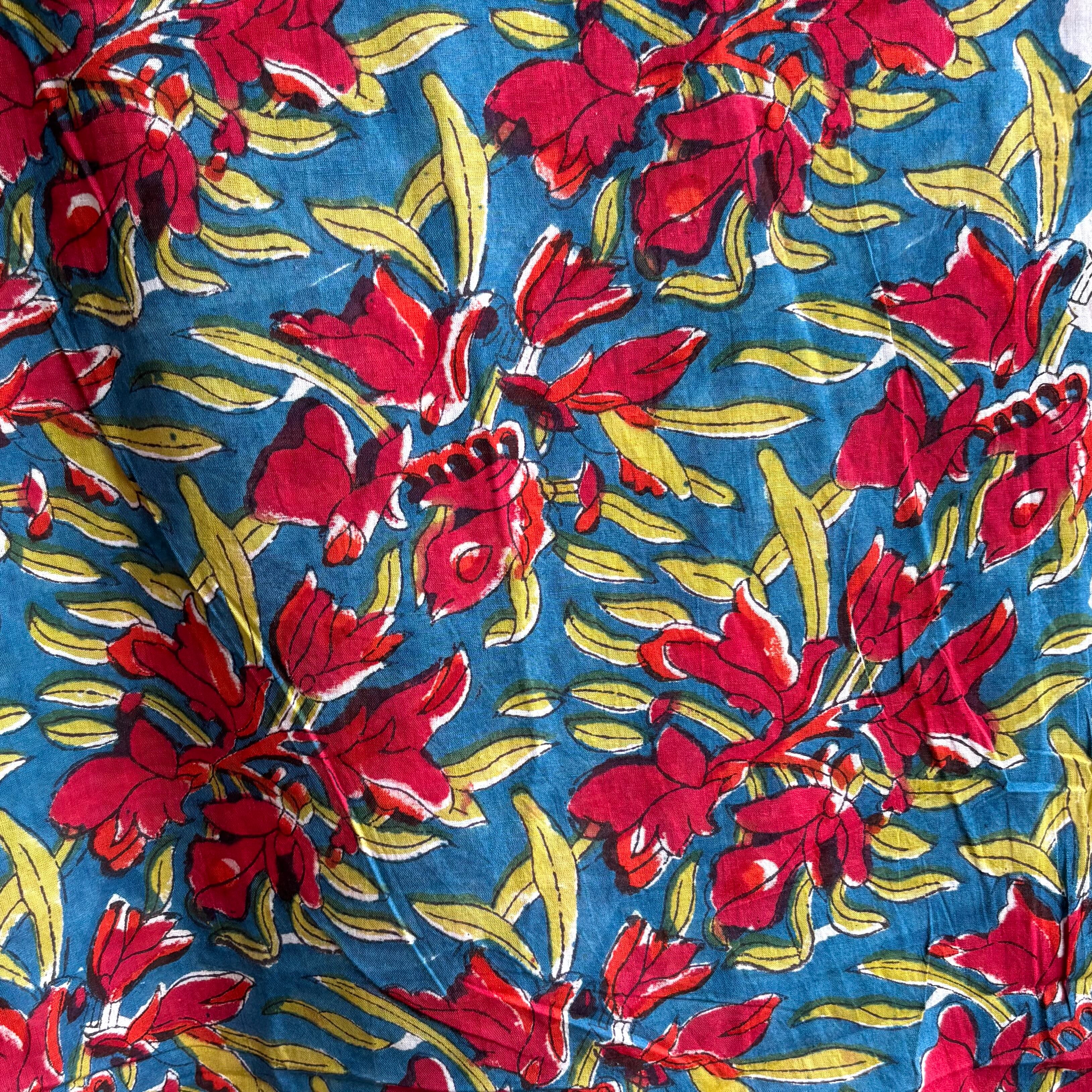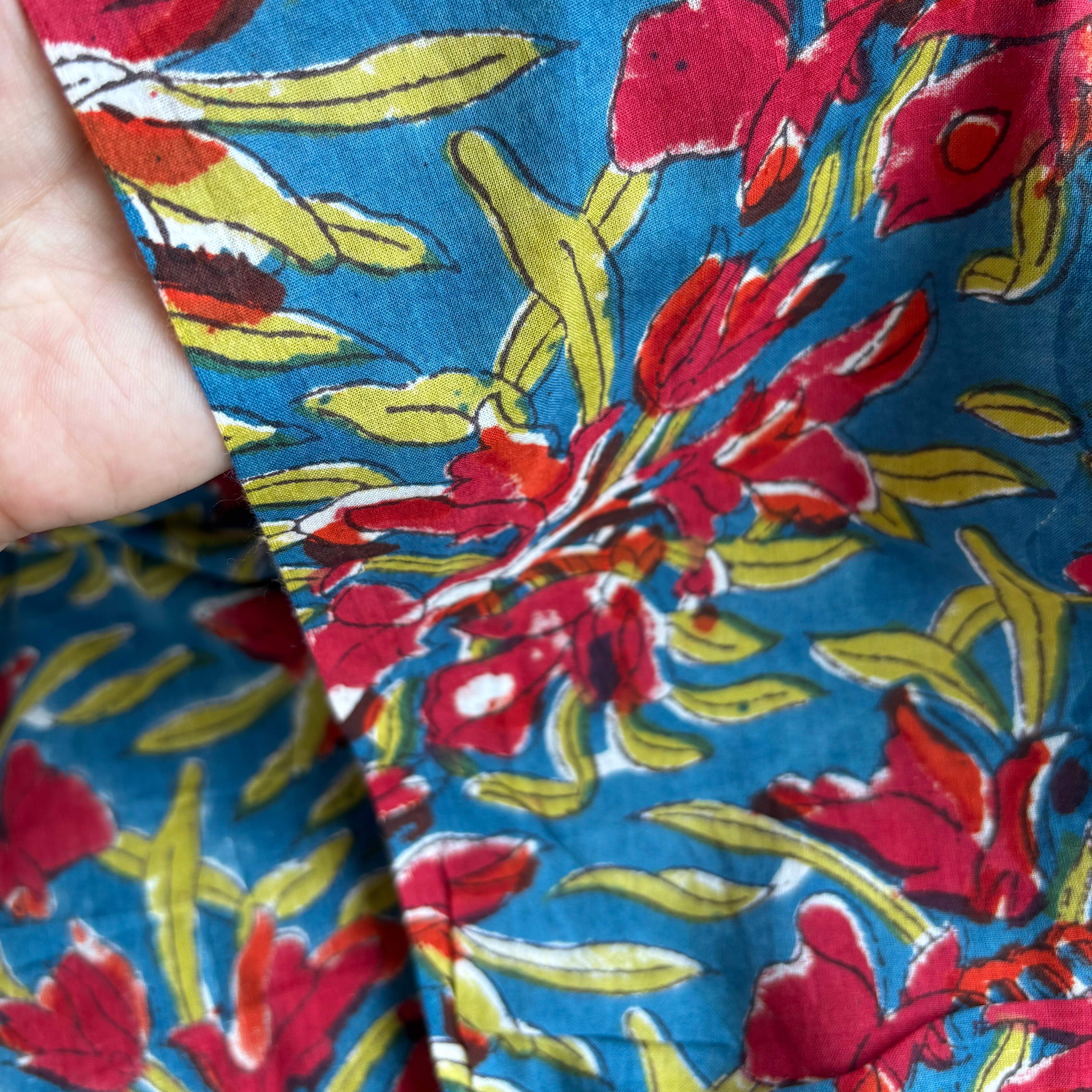 職人さんの手で彫られた木版を使って、ハンドプリントで作られています。色により違う木版を使い、色の数だけ重ねてゆきます。版と版のつながりに、ズレや重なりが生じますが、ブロックプリントの特徴であり、魅力でもあります。