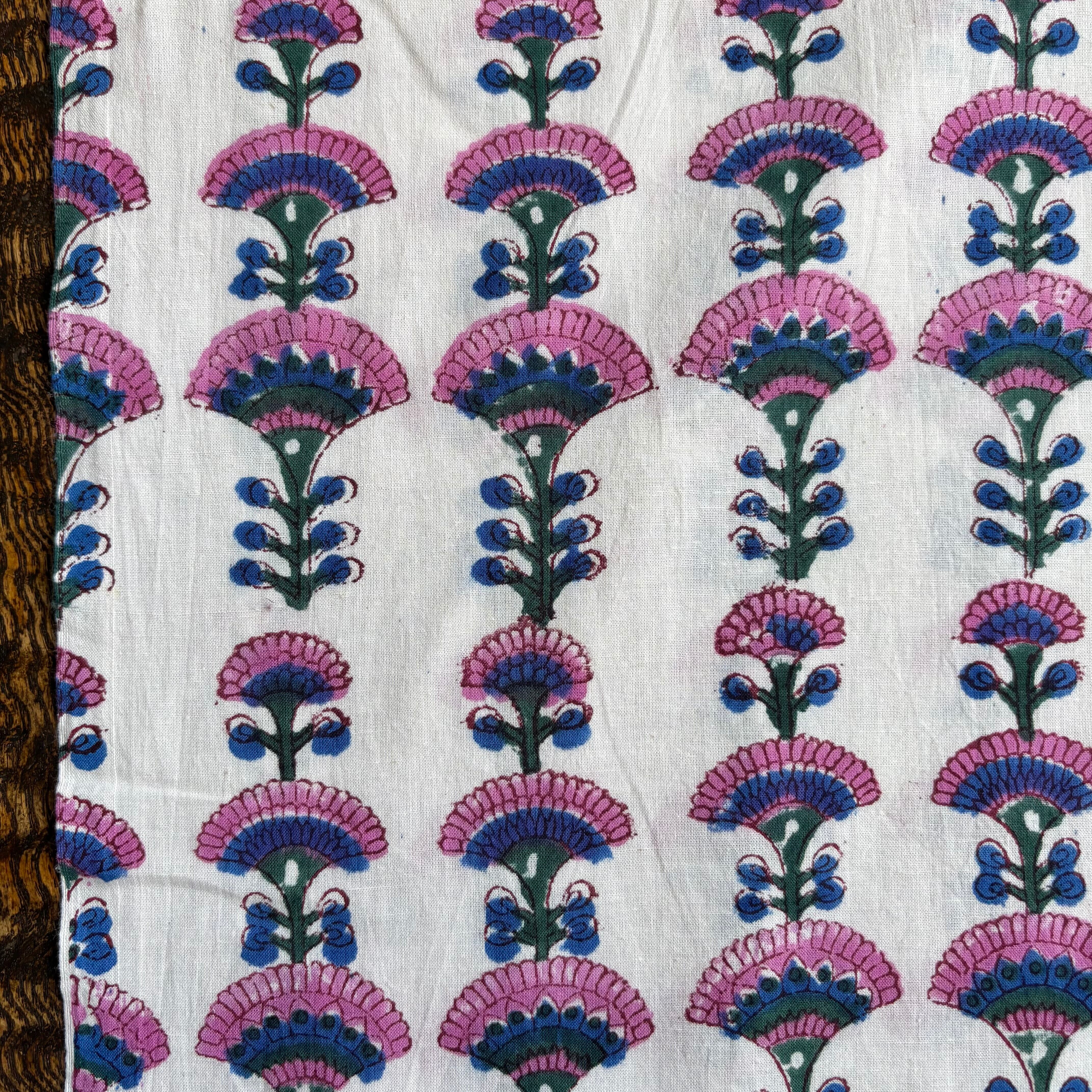 職人さんの手で彫られた木版を使って、ハンドプリントで作られています。色により違う木版を使い、色の数だけ重ねてゆきます。版と版のつながりに、ズレや重なりが生じますが、ブロックプリントの特徴であり、魅力でもあります。