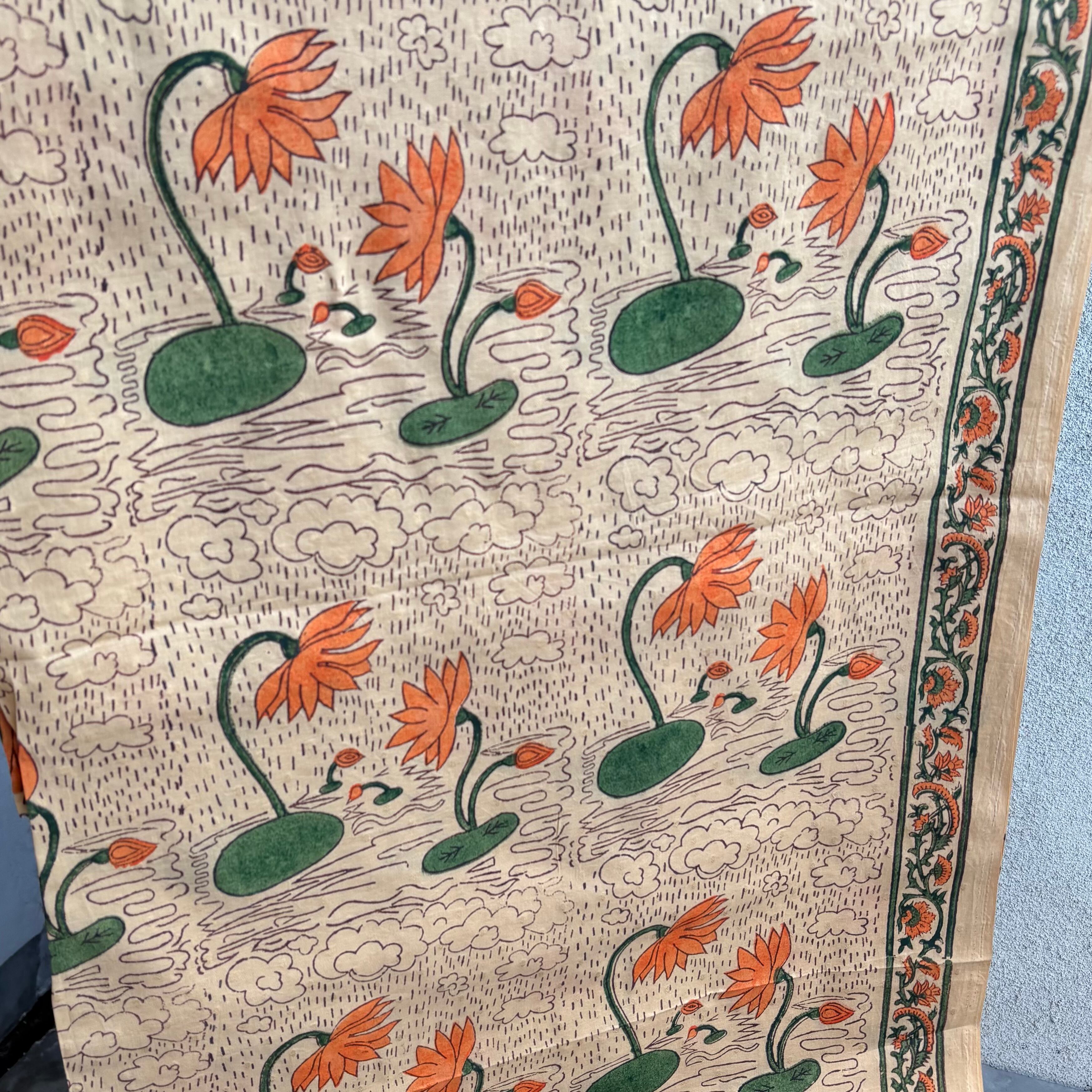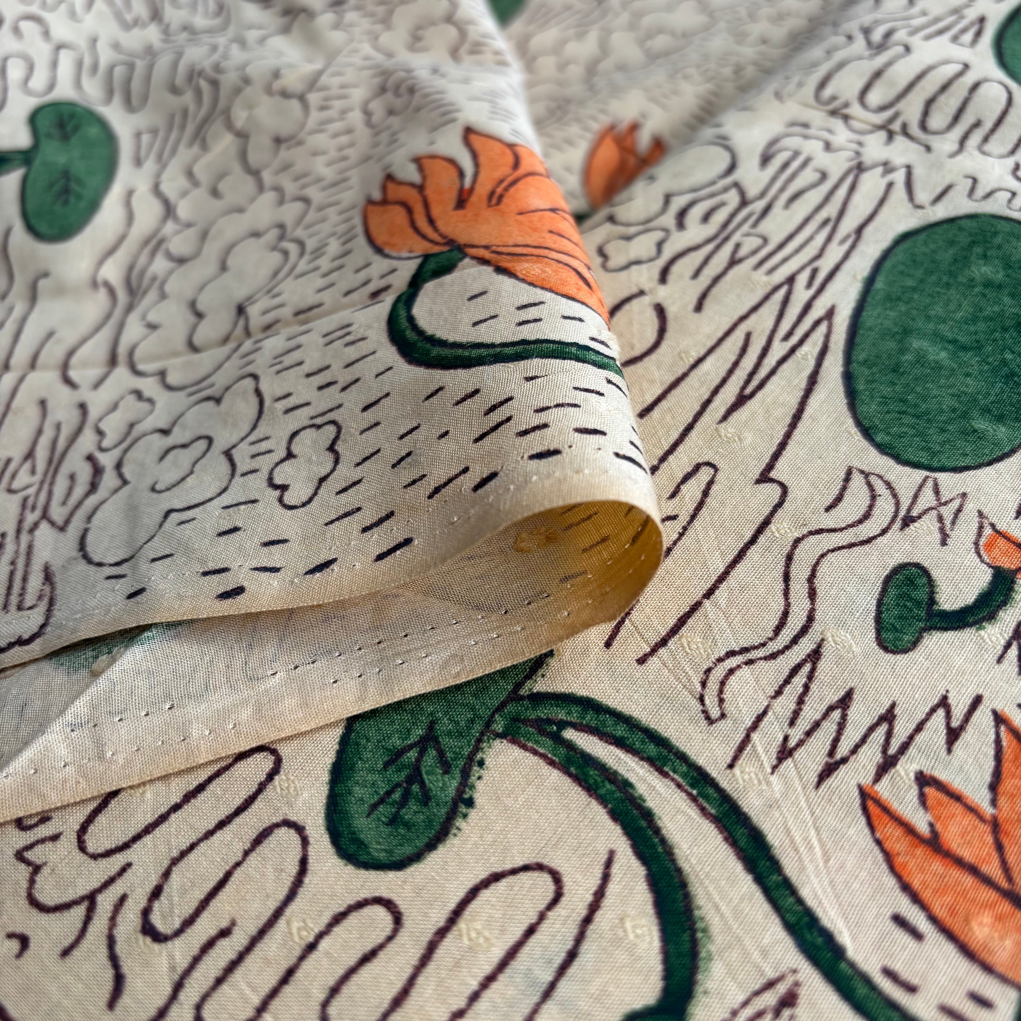 職人さんの手で彫られた木版を使って、ハンドプリントで作られています。色により違う木版を使い、色の数だけ重ねてゆきます。版と版のつながりに、ズレや重なりが生じますが、ブロックプリントの特徴であり、魅力でもあります。