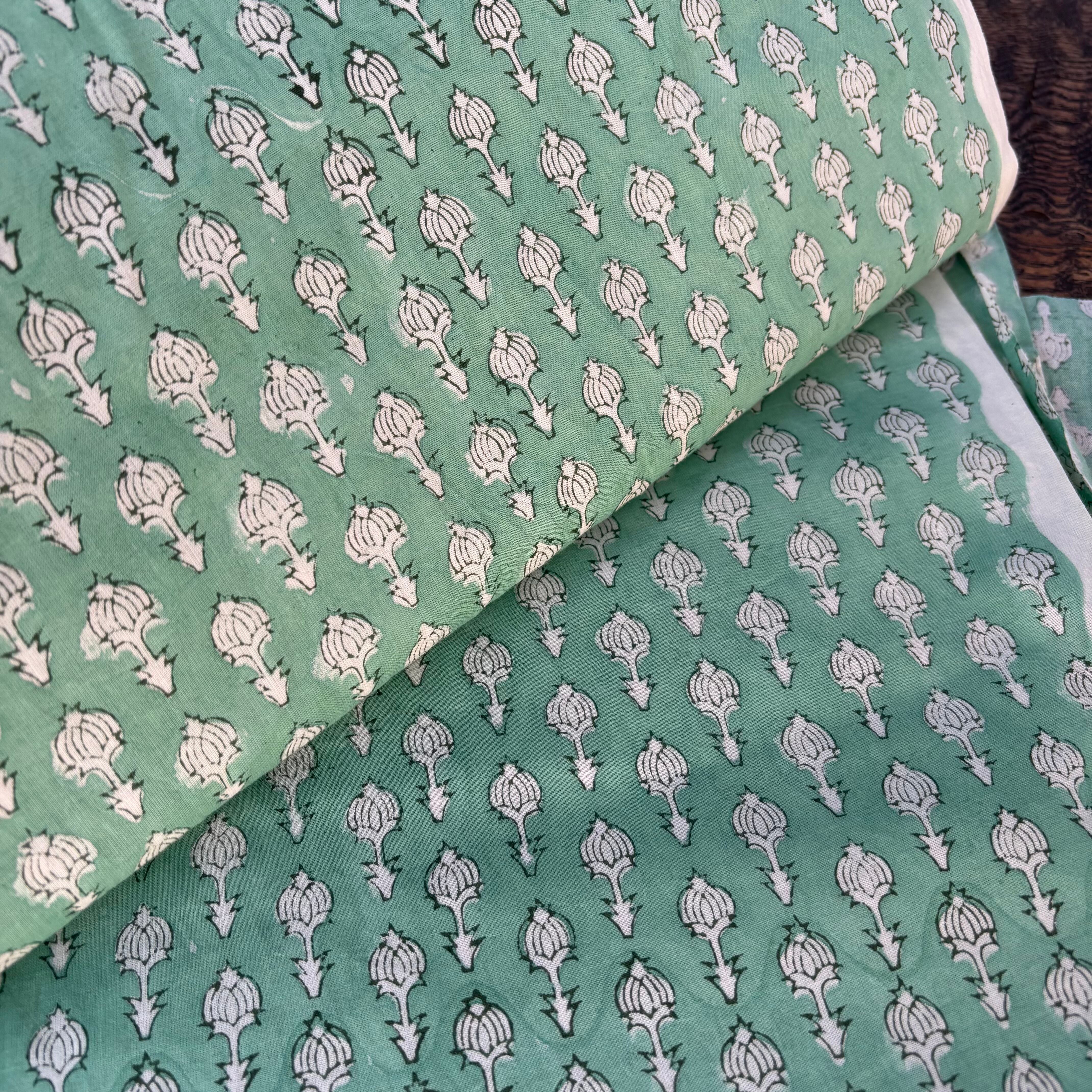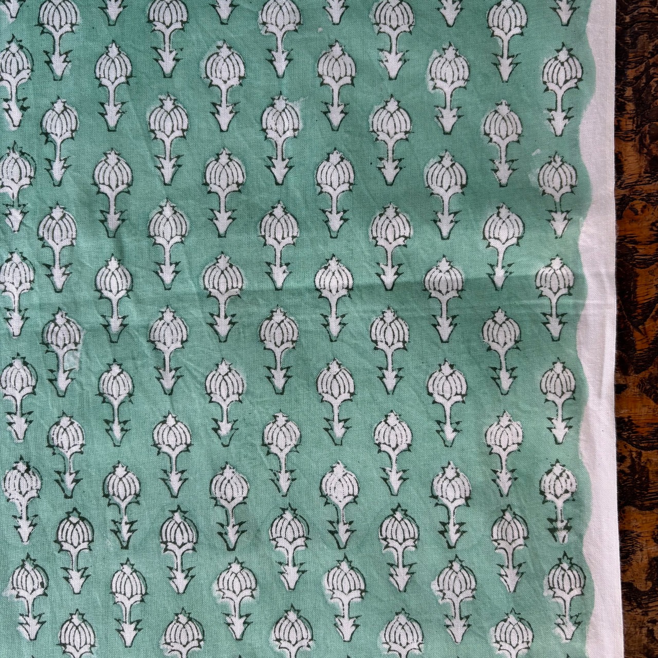 職人さんの手で彫られた木版を使って、ハンドプリントで作られています。色により違う木版を使い、色の数だけ重ねてゆきます。版と版のつながりに、ズレや重なりが生じますが、ブロックプリントの特徴であり、魅力でもあります。