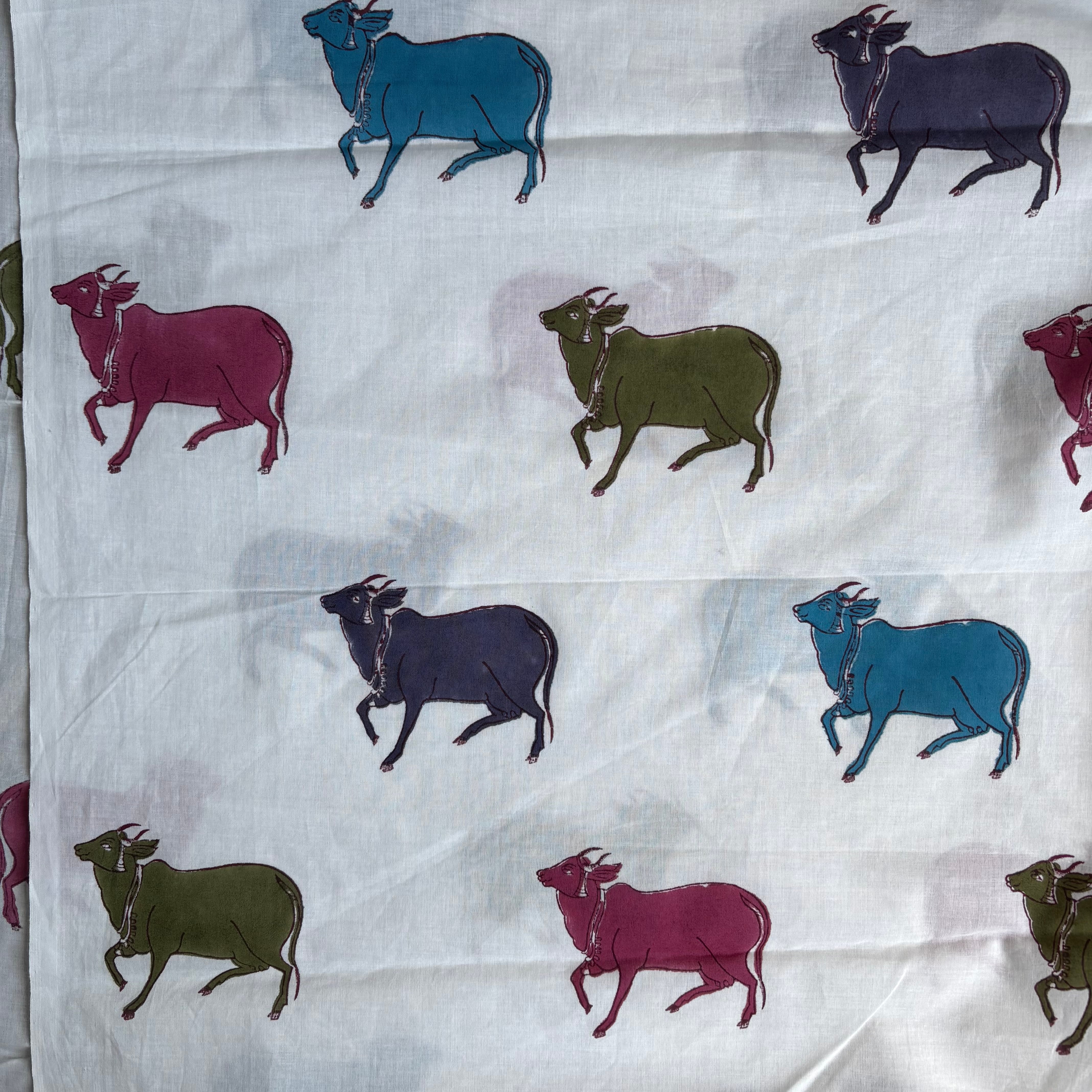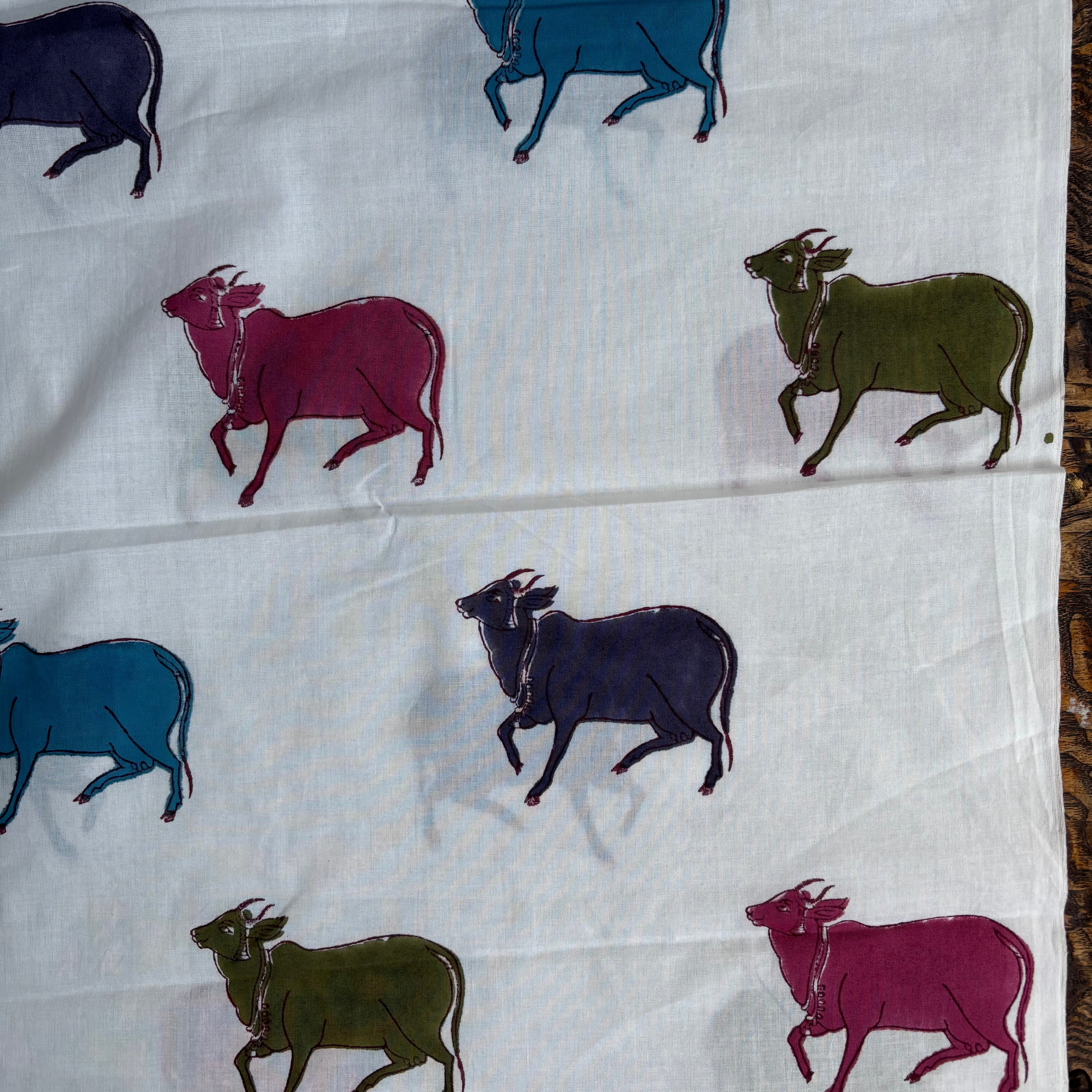 職人さんの手で彫られた木版を使って、ハンドプリントで作られています。色により違う木版を使い、色の数だけ重ねてゆきます。版と版のつながりに、ズレや重なりが生じますが、ブロックプリントの特徴であり、魅力でもあります。