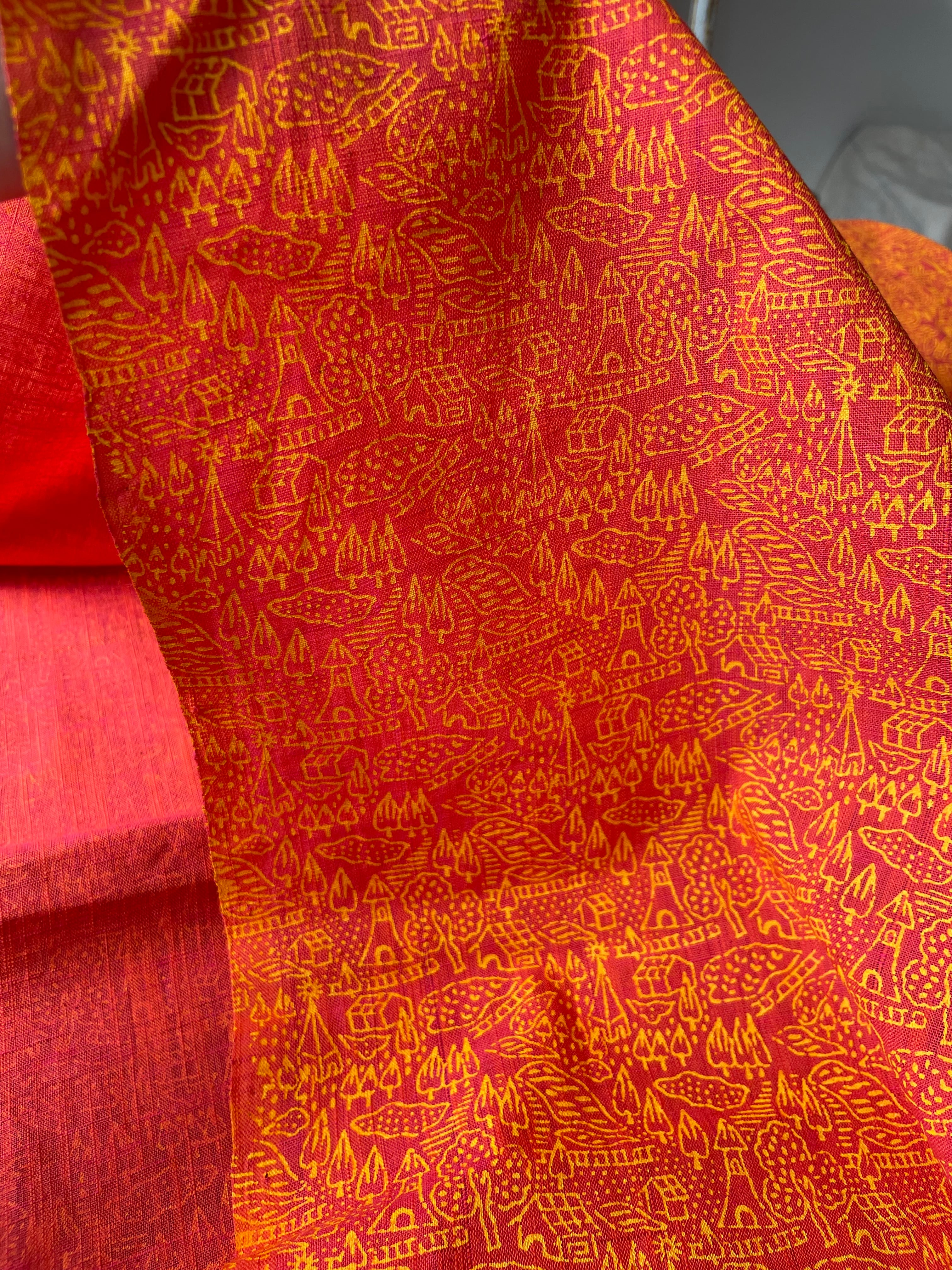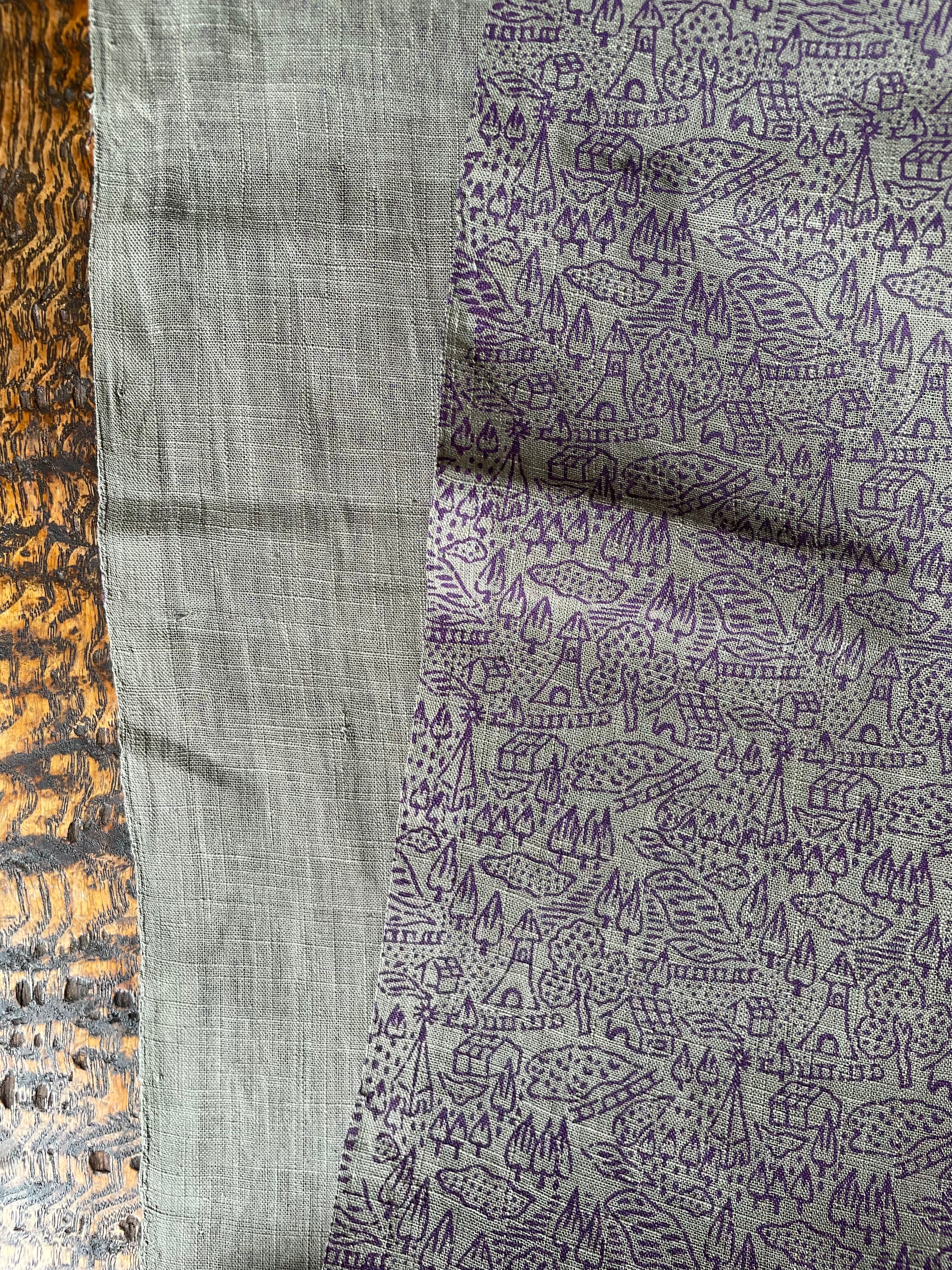 職人さんの手で彫られた木版を使って、ハンドプリントで作られています。色により違う木版を使い、色の数だけ重ねてゆきます。版と版のつながりに、ズレや重なりが生じますが、ブロックプリントの特徴であり、魅力でもあります。